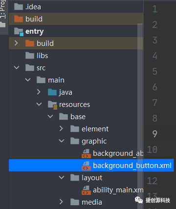 在layout目录下的“ability_main.xml”文件中,使用background_element="$graphic:background_button"的方式引用“background_button.xml”文件: