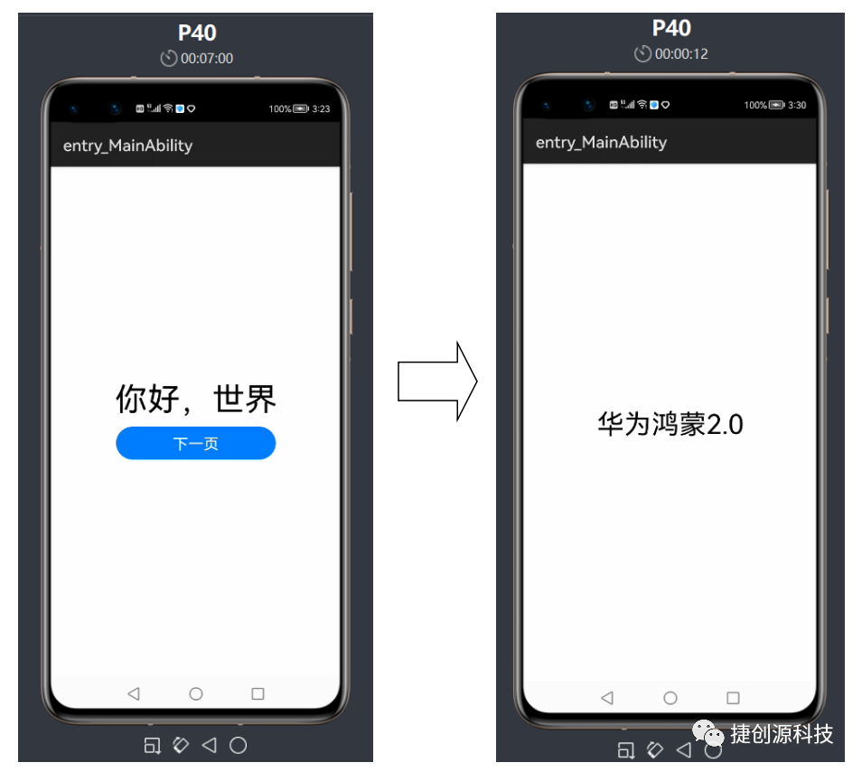 package com.example.myapplication.slice;import ohos.aafwk.ability.AbilitySlice;import ohos.aafwk.content.Intent;import ohos.agp.colors.RgbColor;import ohos.agp.components.DependentLayout;import ohos.agp.components.Text;import ohos.agp.components.element.ShapeElement;import ohos.agp.utils.Color;import ohos.agp.components.DependentLayout.LayoutConfig;public class SecondAbilitySlice extends AbilitySlice {@Overridepublic void onStart(Intent intent) {super.onStart(intent);// 声明布局DependentLayout myLayout = new DependentLayout(this);// 设置布局宽高myLayout.setWidth(LayoutConfig.MATCH_PARENT);myLayout.setHeight(LayoutConfig.MATCH_PARENT);// 设置布局背景为白色ShapeElement background = new ShapeElement();background.setRgbColor(new RgbColor(255, 255, 255));myLayout.setBackground(background);// 创建一个文本Text text = new Text(this);text.setText("华为鸿蒙2.0");text.setWidth(LayoutConfig.MATCH_PARENT);text.setTextSize(100);text.setTextColor(Color.BLACK);// 设置文本的布局DependentLayout.LayoutConfig textConfig = new DependentLayout.LayoutConfig(LayoutConfig.MATCH_CONTENT, LayoutConfig.MATCH_CONTENT);textConfig.addRule(LayoutConfig.CENTER_IN_PARENT);text.setLayoutConfig(textConfig);myLayout.addComponent(text);super.setUIContent(myLayout);}}