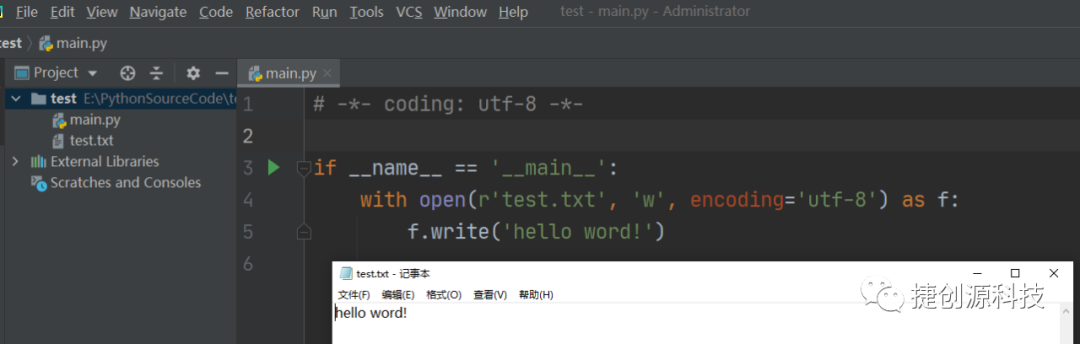 # -*- coding: utf-8 -*-if __name__ == '__main__':with open(r'test.txt', 'w', encoding='utf-8') as f:f.write('hello word!')with open(r'test.txt', 'r', encoding='utf-8') as f:strText = f.read()print(strText)