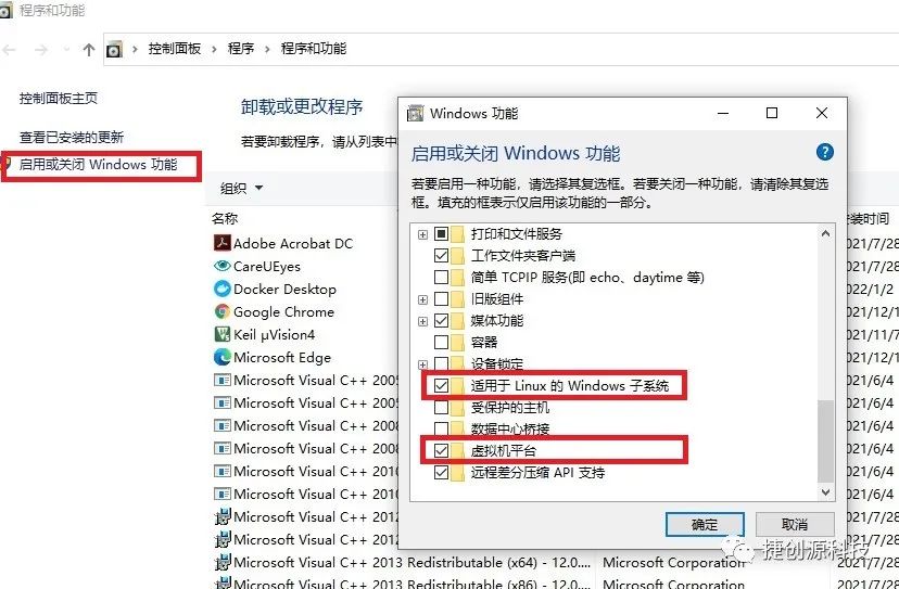 1.按照下图,开启“适用于Linux的Windows子系统”和“虚拟机平台”功能,按照提示重启计算机。