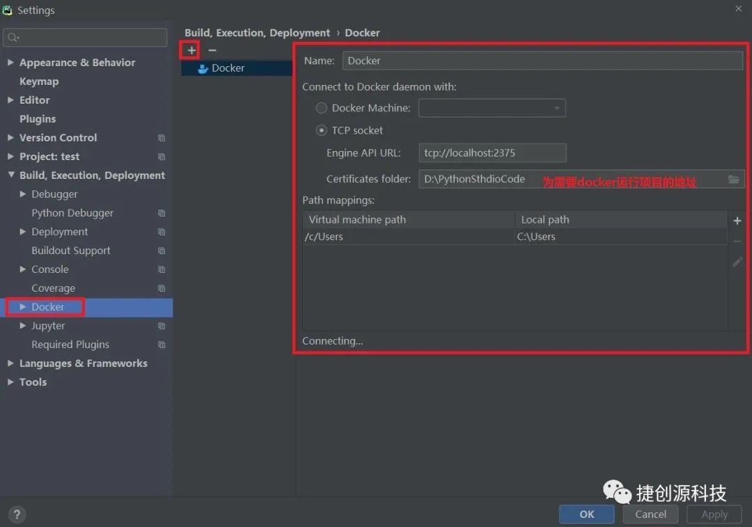 1.启动Docker,按照下图设置,勾选Expose daemon on tcp://localhost:2375 without TLS,并重启Docker。