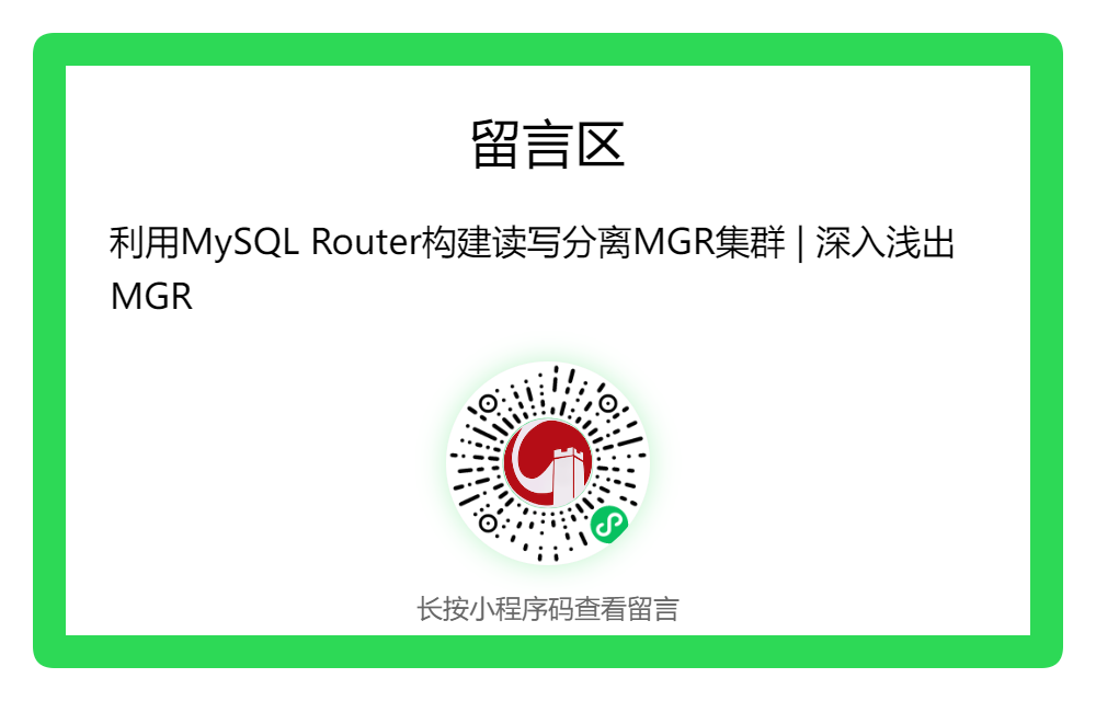 ##参数解释# 参数 --bootstrap 表示开始初始化# 参数 GreatSQL@172.16.16.10:3306 是MGR服务专用账号# --user=mysqlrouter 是运行mysqlrouter进程的系统用户名#$ mysqlrouter --bootstrap GreatSQL@172.16.16.10:3306 --user=mysqlrouterPlease enter MySQL password for GreatSQL: <-- 输入密码# 然后mysqlrouter开始自动进行初始化# 它会自动读取MGR的元数据信息,自动生成配置文件Please enter MySQL password for GreatSQL:# Bootstrapping system MySQL Router instance...- Creating account(s) (only those that are needed, if any)- Using existing certificates from the '/var/lib/mysqlrouter' directory- Verifying account (using it to run SQL queries that would be run by Router)- Storing account in keyring- Adjusting permissions of generated files- Creating configuration /etc/mysqlrouter/mysqlrouter.conf# MySQL Router configured for the InnoDB Cluster 'MGR1'After this MySQL Router has been started with the generated configuration $ /etc/init.d/mysqlrouter restartor $ systemctl start mysqlrouteror $ mysqlrouter -c /etc/mysqlrouter/mysqlrouter.confthe cluster 'MGR1' can be reached by connecting to:## MySQL Classic protocol <-- MySQL协议的两个端口- Read/Write Connections: localhost:6446- Read/Only Connections: localhost:6447## MySQL X protocol <-- MySQL X协议的两个端口- Read/Write Connections: localhost:6448- Read/Only Connections: localhost:6449