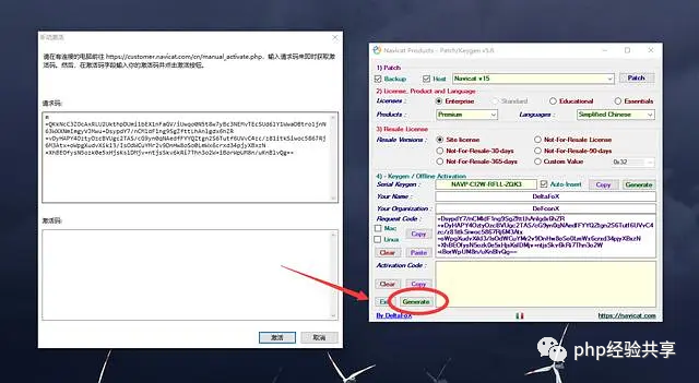5、在Keygen Offline Activation一栏中,点击Generate按钮就会生成一个许可证秘钥,将许可证秘钥复制后就打开Navicat Premium 15
