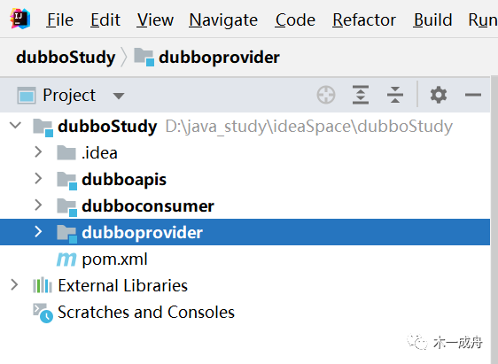 首先创建dubbostudy工程,随后分别创建dubboapis,dubboprovider以及dubboconsumer三个模块,这里面