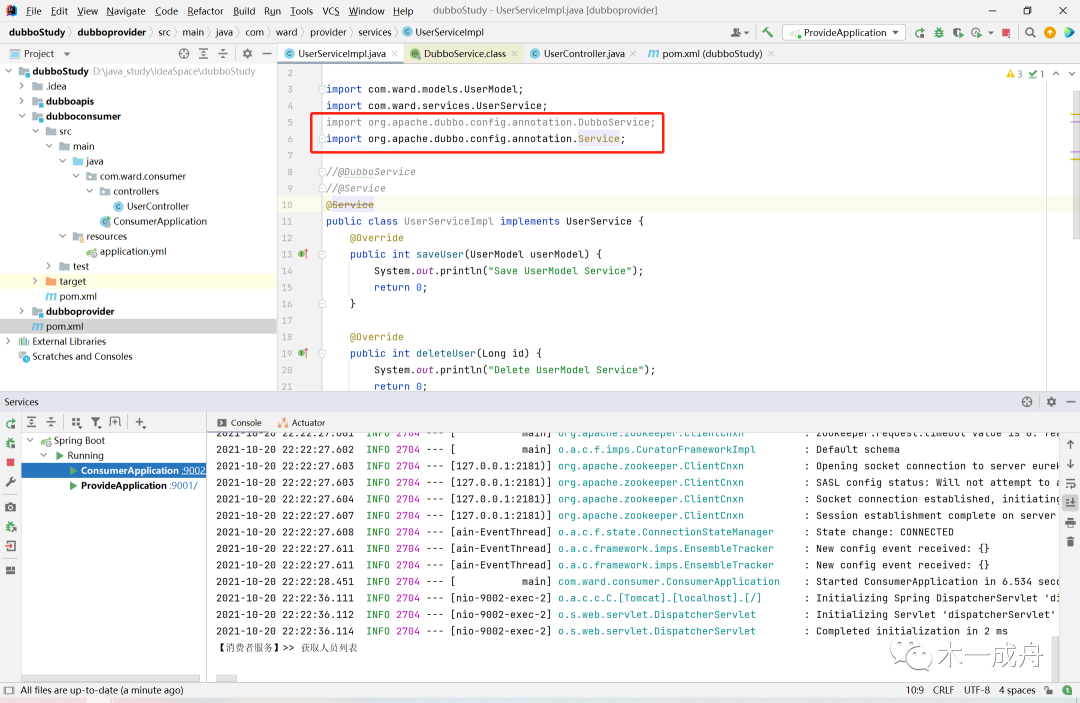注意,这里的@DubboService注解。一开始啥也不知道,按照习惯会使用Spring的@Service,可以试下有没有问题。我这里看到了DubboService就直接用了,没有使用Service注解。