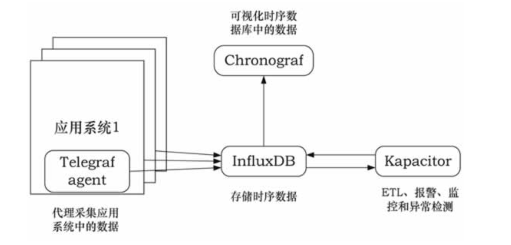 对于一个具体的时间序列应用来说,除存储外,还需要集成数据采集、可视化和告警功能。为此,InfluxData 社区相应提供了 Telegraf(数据采集)、Chronograf(数据可视化)、Kapacitor(告警)三个开源项目,再加上 InfluxDB,能部署成一个完整的时间序列应用系统(简称为 TICK)。这四者的关系如图 1 所示。