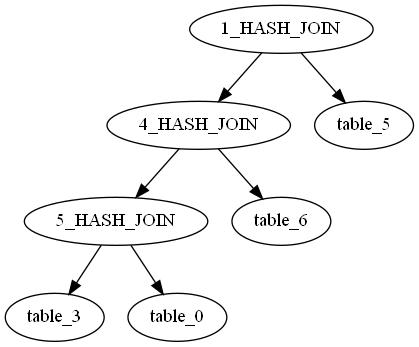 digraph binaryTree{ "1_HASH_JOIN"->"4_HASH_JOIN";"1_HASH_JOIN"->"table_5"; "4_HASH_JOIN"->"5_HASH_JOIN";"4_HASH_JOIN"->"table_6"; "5_HASH_JOIN"->"table_3";"5_HASH_JOIN"->"table_0"; } -