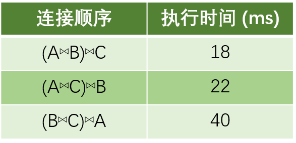 - 其中OceanBase所选的连接顺序为(A⋈C)⋈B,则其排名为2。