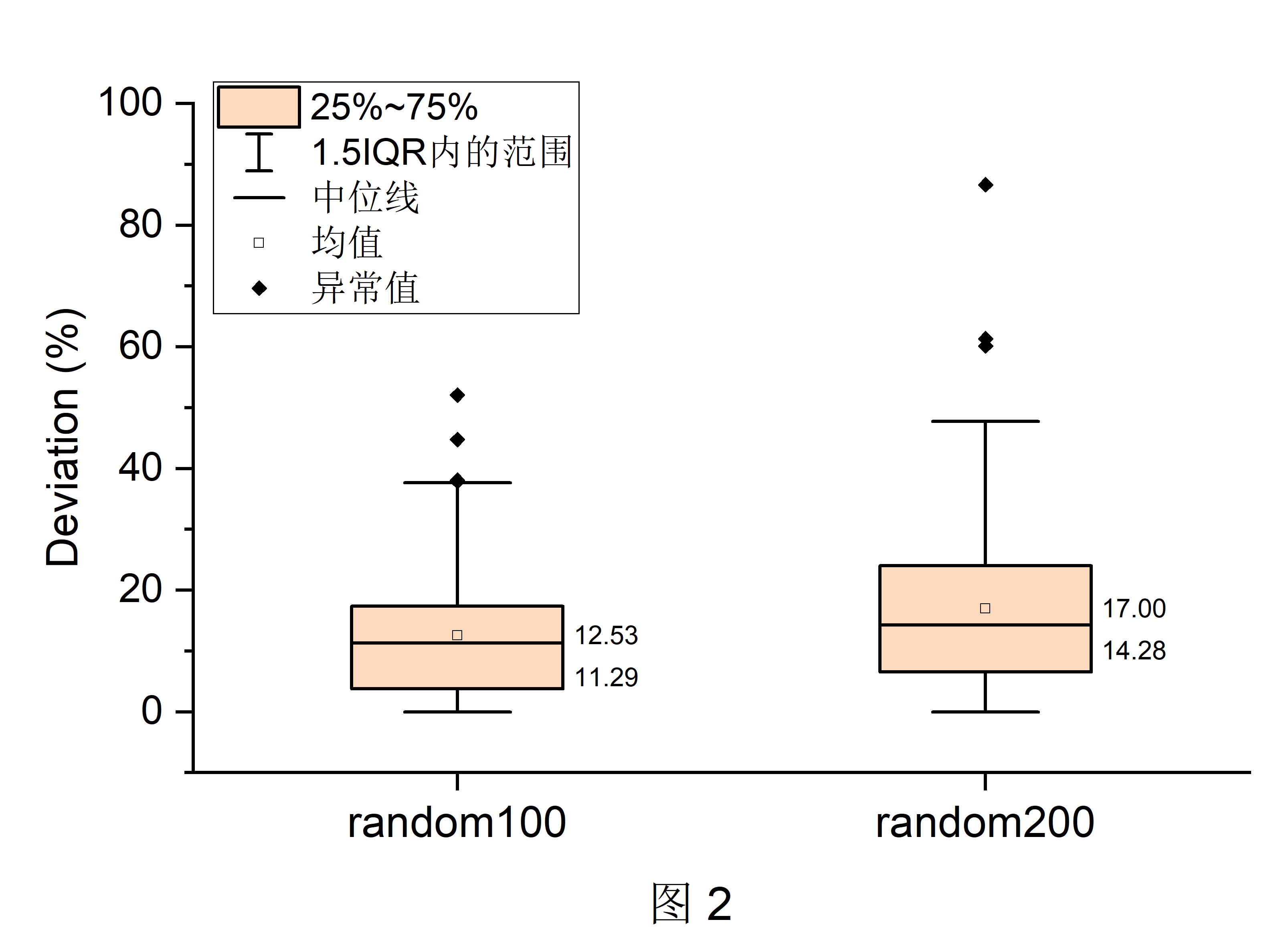 图2 展示了7张表参与连接时,分别随机选择100个连接顺序(random100)与随机选择200个连接顺序(random200)的deviation结果对比。我们可以看到,当随机的搜索空间增大时,deviation整体呈现增长趋势,中位线从11.29%增长到14.28%(增长了0.3倍),均值从12.53%增长到17.00%(增长了0.4倍)。同时,random200的MRR值为0.25,比random100的MRR值0.34下降了26.47%。这个结果说明了图1 的下降趋势与搜索空间的大小有关,即我们设定的搜索空间大小很大程度上影响了最终结果的准确性。