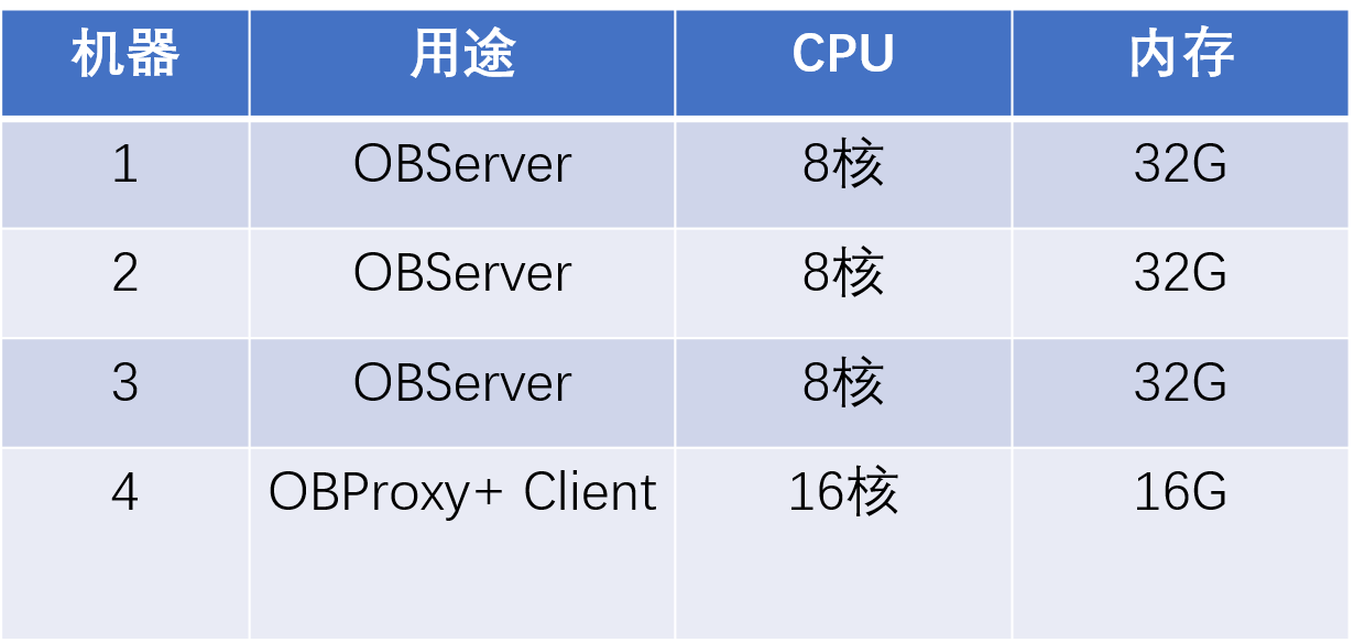 本次实验将OceanBase部署在4台机器上,机器配置如下: