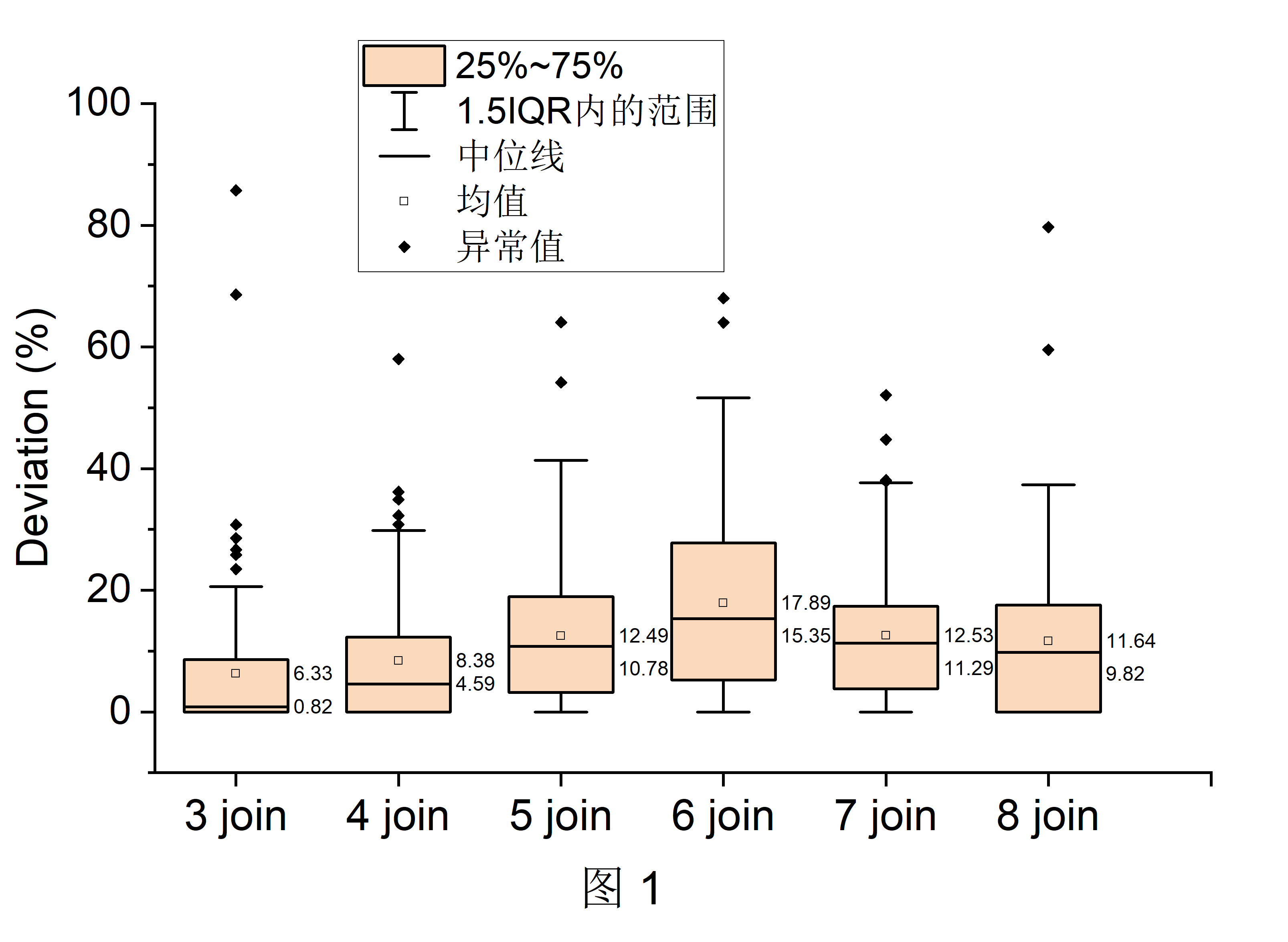 从图1中,我们可以看到偏差最大的是3 join中的一点 (85.73%)。