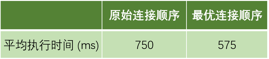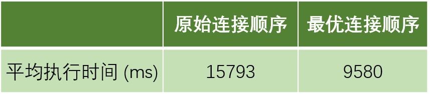 ((table_4⋈table_5)⋈table_0)⋈table_9,实验得到最优的连接顺序为((table_0⋈table_9)⋈table_4)⋈table_5。 -
