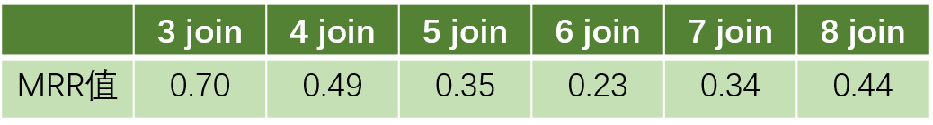 同时,我们也在TiDB上进行了3 join 与4 join的实验,得到的MRR值分别为0.35与0.22,明显劣于OceanBase。