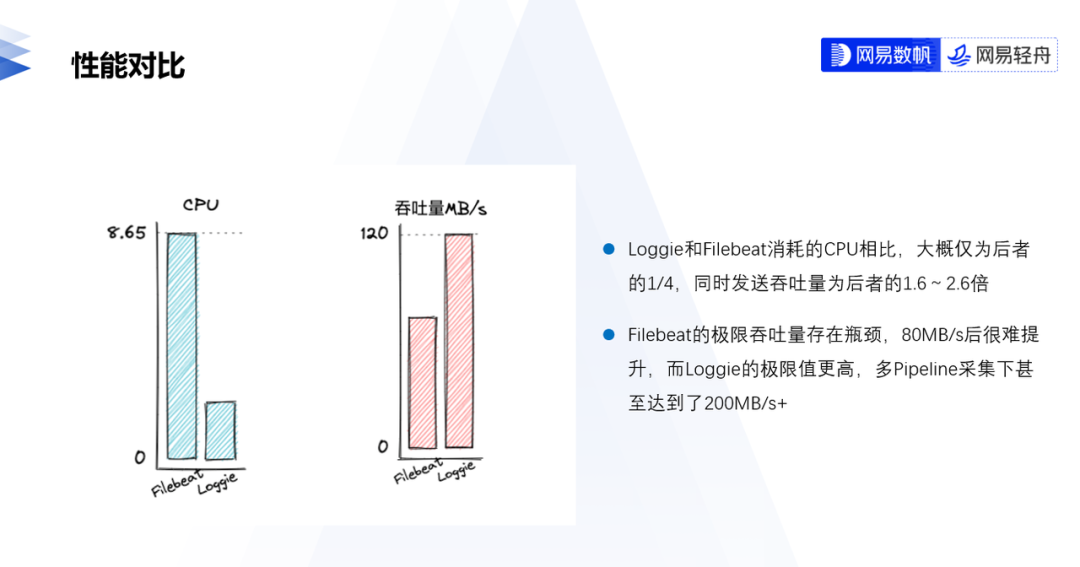 Loggie已经广泛应用于网易内部、中国工商银行以及网易轻舟众多的商业客户环境中。在网易严选业务的实测中,Loggie消耗的CPU仅为之前方案的1/4,同时发送吞吐量为后者的1.6~2.6倍,并且在多Pipeline采集下甚至达到了200MB/s+极限吞吐量。
