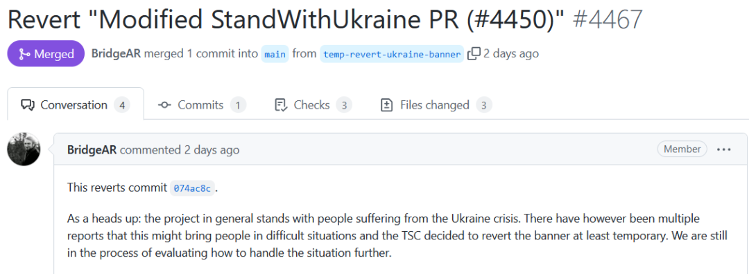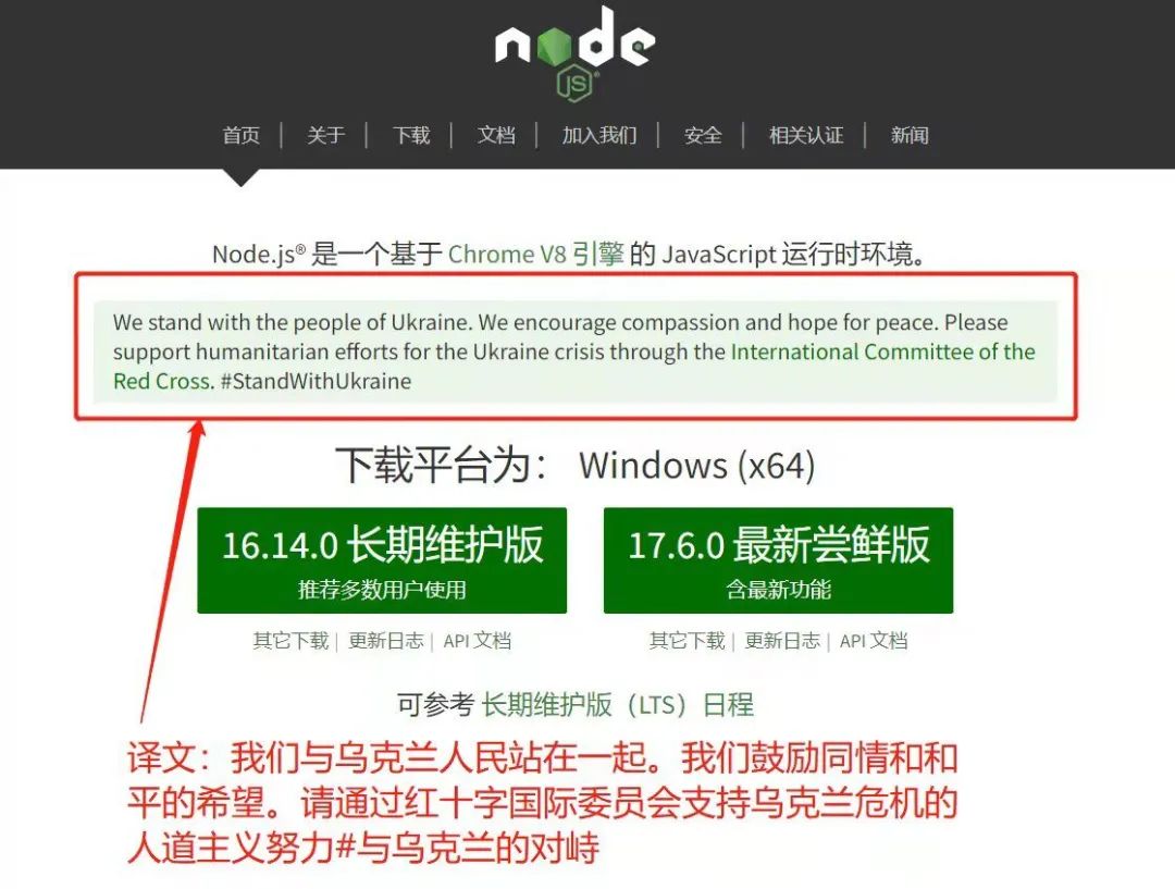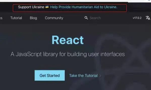 现在 Node 和 React 官网的宣示都被撤下。React 团队在 GitHub 上表示自己支持危机中的乌克兰受难平民的立场未改,不过更换 banner「给某些人带来了困扰」,所以暂时撤下,继续衡量之后如何作为。