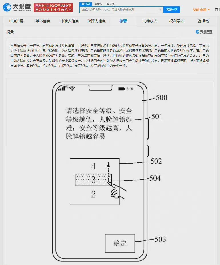 天眼查 App 显示,近日,华为技术有限公司申请的「显示屏解锁的方法及其设备」专利公布。