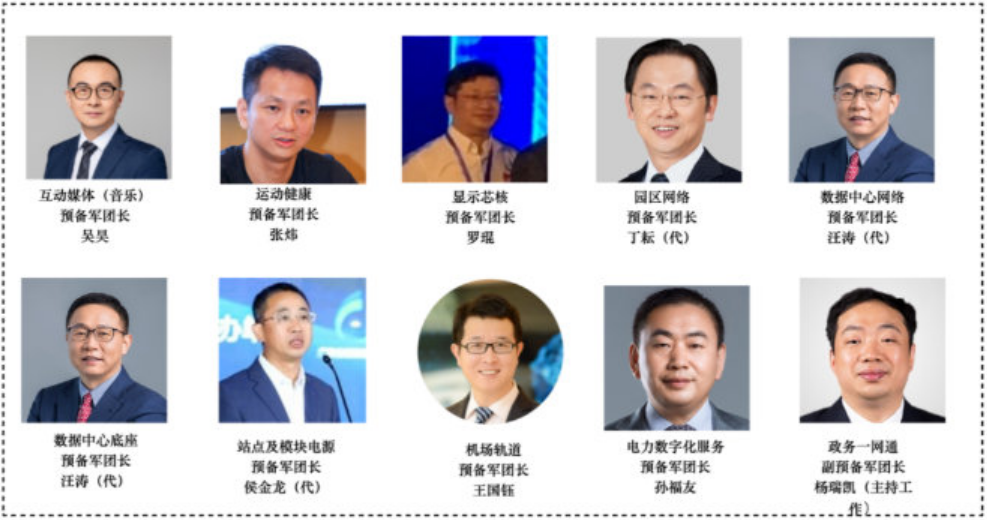 这 10 位团长分别为,互动媒体(音乐)预备军团长吴昊、运动健康预备军团长张炜、显示芯核预备军团长罗琨、园区网络预备军团长丁耘(代)、数据中心网络、数据中心底座两个预备军团长均为汪涛(代)、站点及模块电源预备军团长侯金龙(代)、机场轨道预备军团长王国钰、电力数字化服务预备军团长孙福友、政务一网通副预备军团长杨瑞凯(主持工作)。