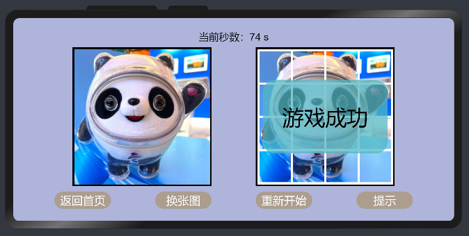 中间两个画布:左边是参照用的原图;右边是打乱后的拼图和默认隐藏的弹窗。分别用两个 canvas 组件显示原图和 n×n 的拼图,使用 stack 布局方便设置游戏完成时显示的弹窗。