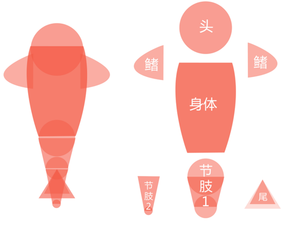 先看设计图,我们的小鱼由头、鳍、身体、节肢、尾部五部分组成。