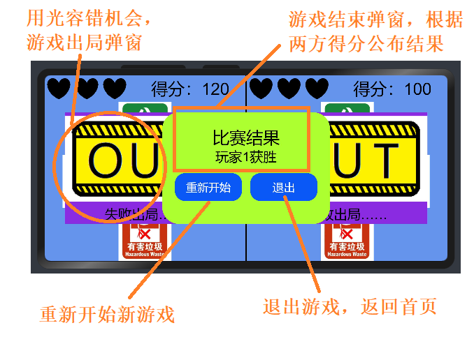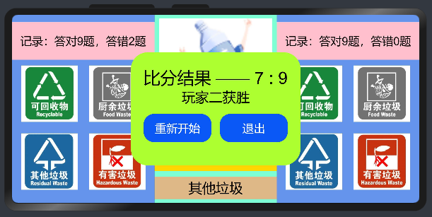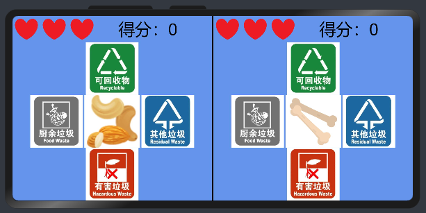 游戏界面分为左右两边,两名玩家分别操作左右两边,对随机出现的垃圾进行分类,答对加分,答错扣一颗心,答错 3 次后出局,双方都出局后最终得分高者获胜。