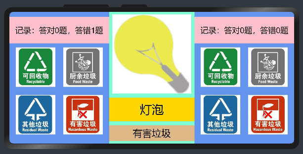 得分判断:将玩家选择分类与垃圾正确分类做对比,该玩家的答对或答错记录加一。