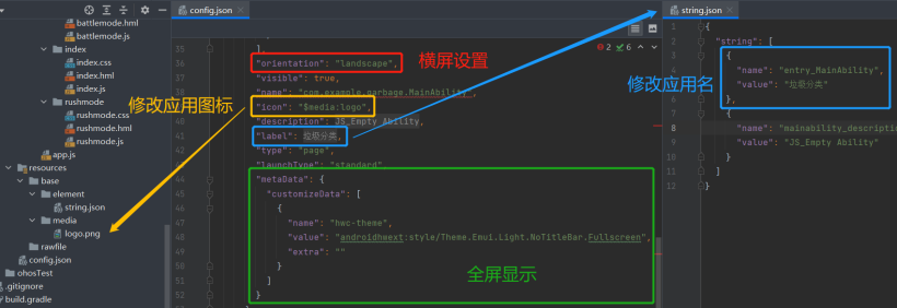 横屏设置:在 config.json 文件中设置 orientation 属性为 landscape