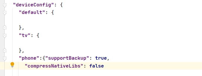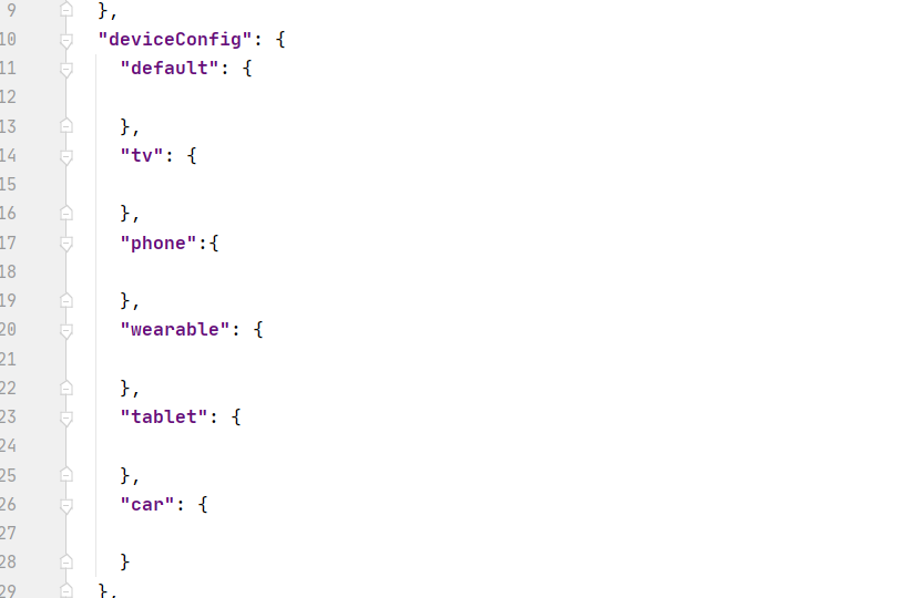 deviceConfig 对象包含了具体设备上的应用配置信息,它的的内部结构可由 default(通用设备),phone(手机),tablet(平板),tv(智慧屏),car(车机),wearable(智能穿戴)等属性组成。