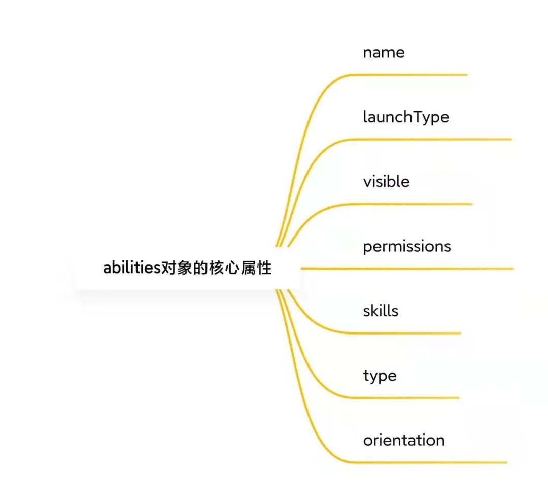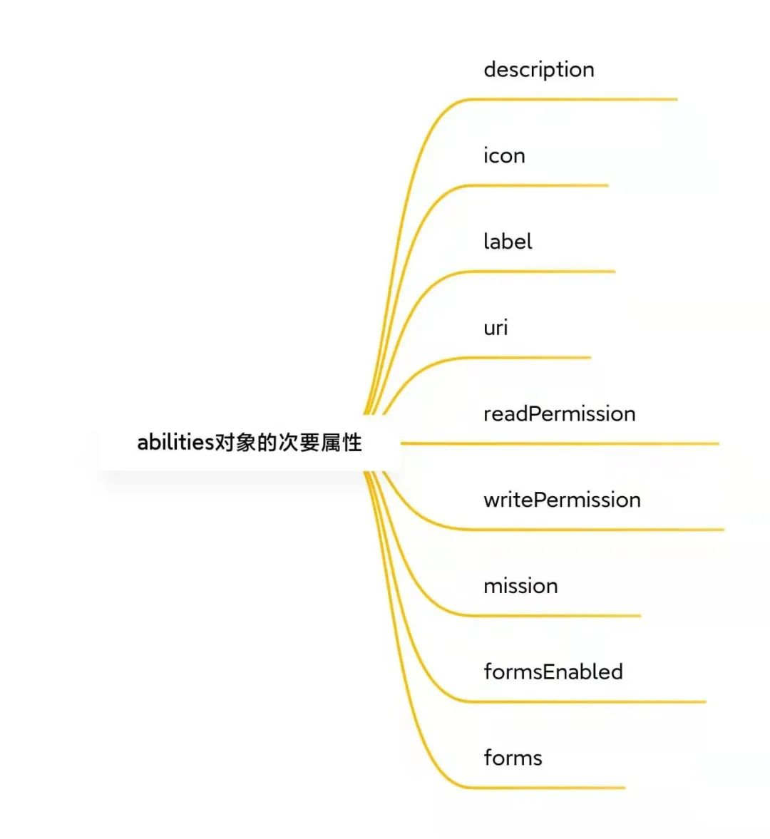 abilites 的次要属性包括 description,icon,label,uri,readPermission,writePermission,mission,formsEnabled,forms九种。