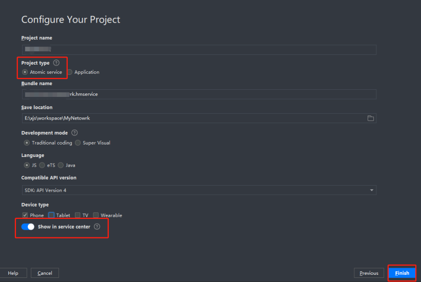 在 DevEco Studio 中创建项目,选择原子化服务,启动“show in service center”。