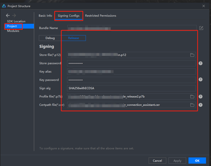 配置 release 环境的签名与认证:说明,发布之前必须要构建 release 的签名包,所以你必须需要在 AGC 平台上申请相关发布的数字认证和 Profile 文件。