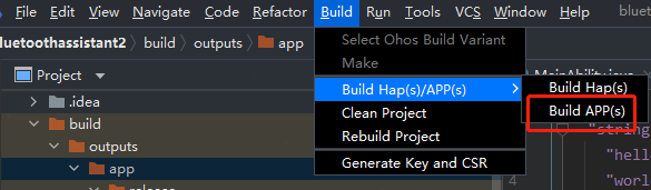 构建 APP:点击 IDE 的菜单:Build->Build Hap(s)/APP(s)->Build APP(s)。