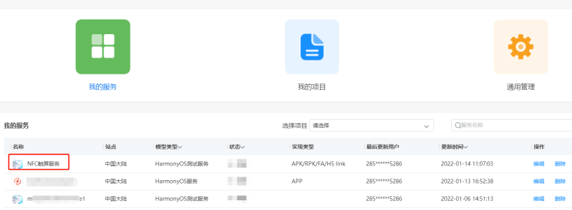 编辑服务:打开需要申请 NFC 标签的服务(HarmonyOS 服务开放平台),点击“编辑”。