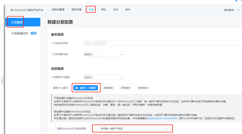 申请支持碰一碰 NFC 标签:在 HarmonyOS 服务开放平台的“分发”菜单中申请支持碰一碰/扫一扫触发标签。