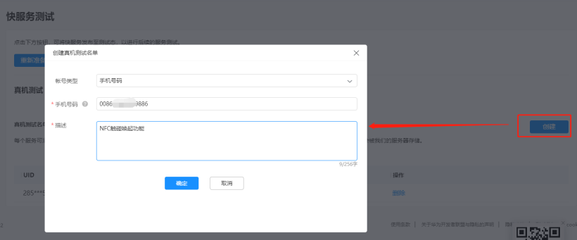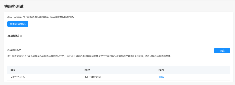 添加测试用户:可以构建自己下需要添加测试用户,此用户必须为华为注册用户。