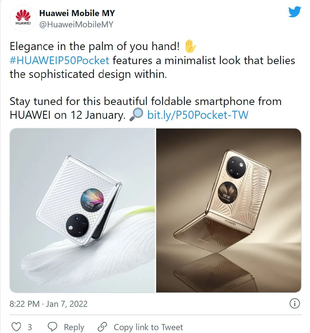 值得一提的是,华为马来西亚在社交平台近日发布消息称,P50 Pro 和 P50 Pocket 将在 1 月 12 日全球发布,或将搭载骁龙 888 4G,运行 EMUI 12 系统。