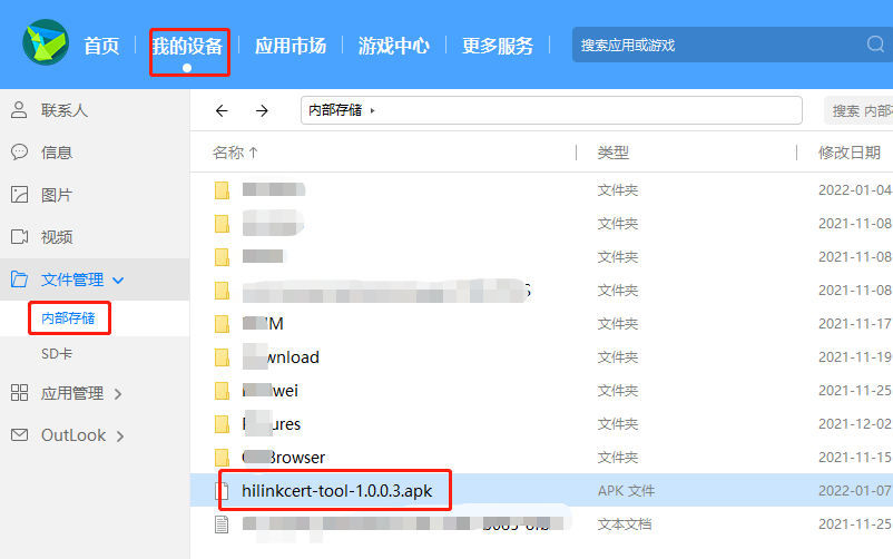 说明:使用 USB 将手机连接 PC 端,将 AirLink 工具安装包拷贝“内部存储”根目录,通过手机端的文件夹管理器打开后,手动点击安装。这种方式比较简单,就不一一介绍。