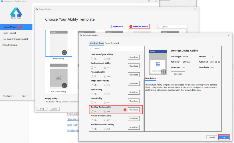 手机端就简单了,安装 DevEco Studio 3.0 Beta1 及以上版本,然后 IDE 自带 OneHop 的模板。