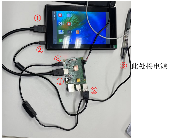 连接开发板和其他硬件:按照图 6 所示的硬件连接示意图(图中每两个相同的序号分别表示同一根数据线的两端),用 HDMI 线①为树莓派开发板连接显示屏,用 DC 线②为显示屏供电,用电源线③连接开发板和电源。