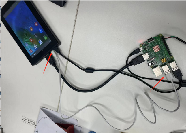 设置显示器触屏:先使用一根数据线(图 9 中灰色数据线),在图 9 所示位置处,将显示器侧面标有“TOUCH”标志的端口和开发板的 USB 口相连。