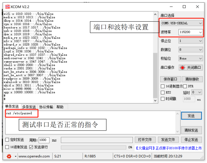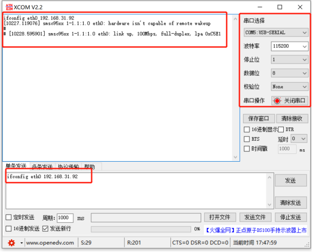 通过串口打开树莓派的 SSH 服务:如图 17,在前面介绍的串口工具 XCOM/XSHELL 中,选择之前已检测正常的串口并保持其他属性选项为默认;在左下角控制台单条发送 ifconfig 命令,用来打开树莓派的 SSH 服务。
