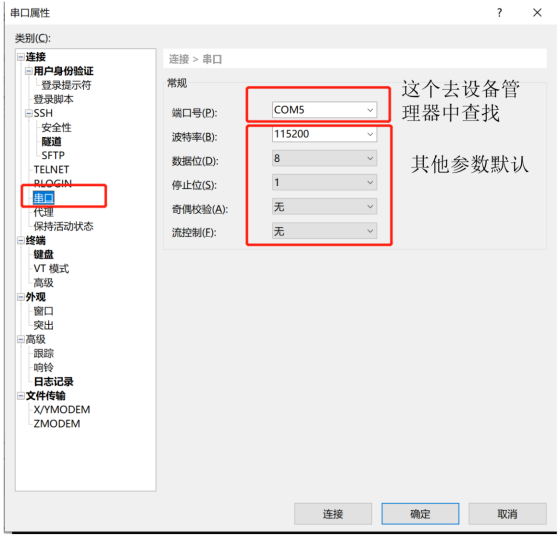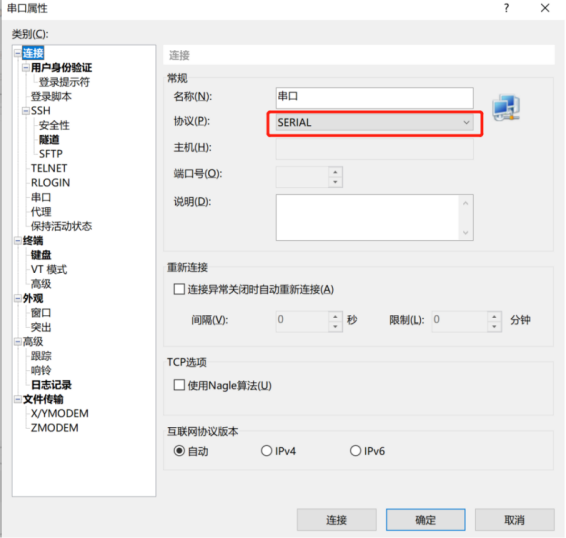 正常运行后,在 XSHELL 下新建一个会话,完成相关参数的设置。设置连接属性可参考图 13 上图,选择协议为红框中的 SERIAL 协议。