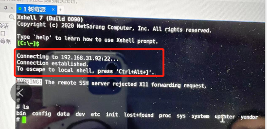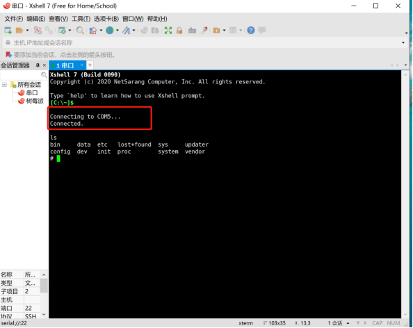 在完成上述所有设置之后,就可以通过 XSHELL 实现串口连接了,若出现“Connected”则说明成功连接,效果如图 14 所示。
