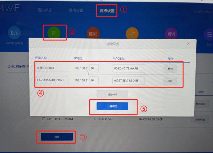 成功登录后,按照图 16 中标记的序号顺序,依次点击设置红框部分:高级设置—IP----添加—弹出“绑定设备”提示框----记录树莓派的 IP 地址并更改设备名称(图中鼠标所致处)-----一键绑定。