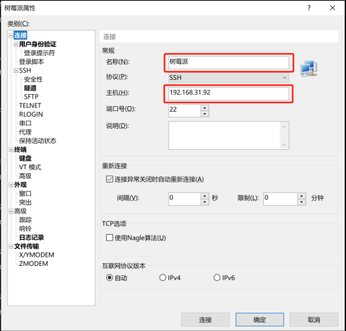 建立与树莓派板子的 SSH 连接:正常运行后,同样使用 XSHELL 新建一个如图 18 的会话,用于设置树莓派的属性即名称和主机 IP,名称可自定义,主机 IP 是之前已从路由器获取的树莓派 IP 地址。