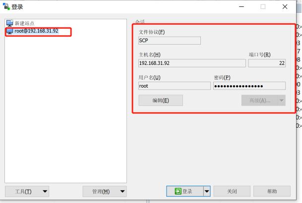 参数设置:启动电脑的 ssh 服务,在 ssh 服务已开启且成功建立连接的情况下,启动 WinScp 工具,在 WinScp 中新建站点,参数设置可参考图 20 红框中的内容。