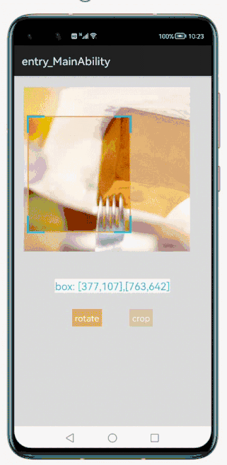 组件区域监听事件:为组件区域对象 imageView 设置监听事件,当裁切框位置发生变化时,将其坐标设置到 Text 对象 boxText 中进行显示。