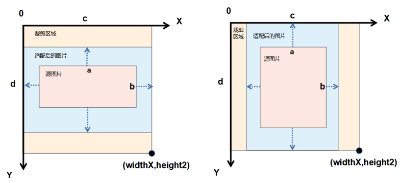 计算完成后将图片放大后的宽和高分别存放在 int 型数组 fitSize[] 中。上述是以原裁切图片尺寸小于裁切图片视图区域为例,反之同理。
