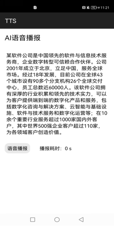 ohos:text="某软件公司是中国领先的软件与信息技术服务商,企业数字转型可信赖合作伙伴。公司2001年成立于北京,立足中国,服务全球市场。经过18年发展,目前公司在全球43个城市设有90多个分支机构26个全球交付中心,员工总数近60000人。该软件公司拥有深厚的行业积累和领先的技术实力,可以为客户提供端到端的数字化产品和服务,包括数字化咨询与解决方案、云智能与基础设施、软件与技术服务和数字化运营等;在10余个重要行业服务超过1000家国内外客户,其中世界500强企业客户超过110家,为各领域客户创造价值。"