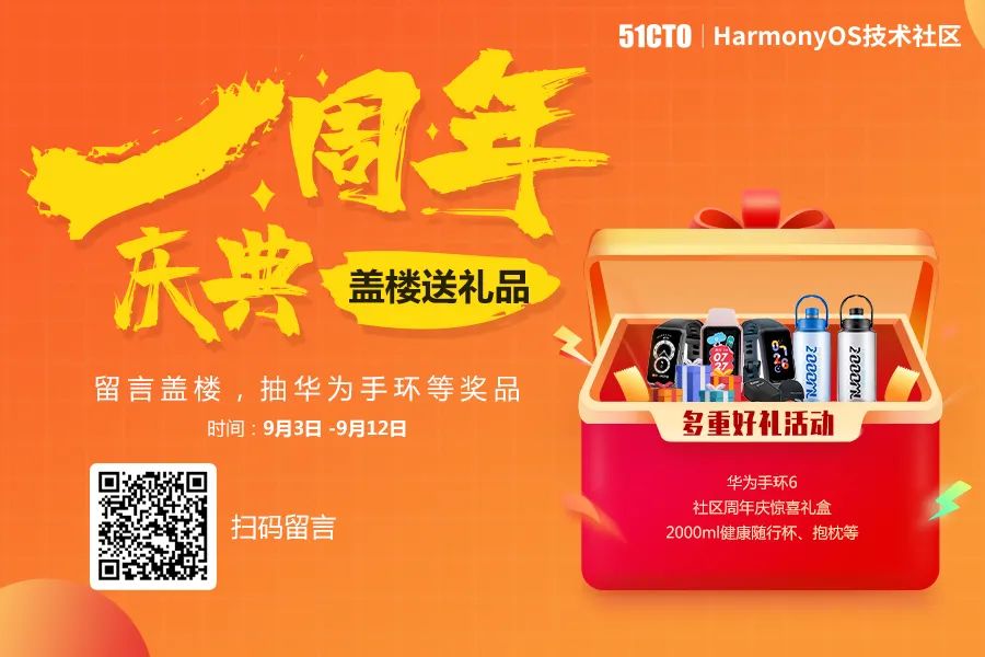 扫码留言,多重好礼等你来拿!!!华为手环 6、社区周年庆惊喜礼盒、2000ml 健康随行杯、抱枕等。