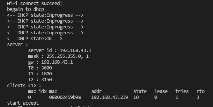 ①开发版编译下载后,重启,会自动连接到 WiFi,并建立 TCP 服务器,等待手机客户端接入:
